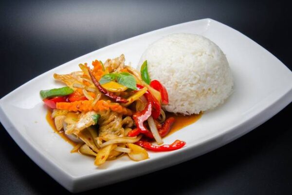 Combination Of Chili, Sweet Basil And Garlic Stir Fried With Seasonal Vegetables.