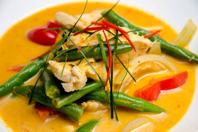 A Creamy Simmered Sweet Red Curry Topped With Sliced Kaffir Lime Leaves.