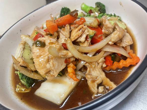 Stir Fried Fresh Chili & Garlic Chicken, Onion, Spring Onion With Seasonal Vegetables.