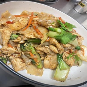 Stir Fried Thick Rice Noodles With Mixed Vegetables, Egg. Fresh Chili And Basil.