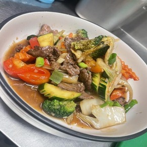 Stir Fry With Our Special Peanut Sauce With Seasonal Vegetables.