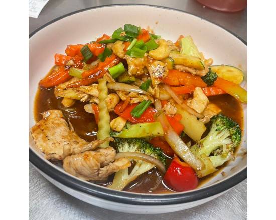 Roasted Cashew Nut Stir Fried With Aromatic Dried Chili Paste With Seasonal Vegetables.